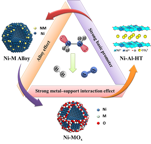肼(N2H4)是一種重要的液體推進劑,在催化劑作用下能夠在室溫下被迅速分解,產生高溫高壓的氣體,實現化學能向動能的轉變。該團隊長期致力于肼分解反應的基礎和應用研究,針對國民經濟的多個應用領域開發了多種肼分解催化劑。實現對肼分解選擇性的調控(高選擇性生成氫氣和氮氣)具有明確的應用價值,是學術界關注的焦點,其核心在于通過對催化劑的優化設計實現其對N-N鍵和N-H鍵斷鍵能力,以及順序的精準控制。該文章重點綜述了該團隊在非貴金屬鎳基催化劑上肼分解制氫活性和選擇性的調控策略:利用堿性助劑效應(Angew. Chem. Int. Ed., AIChE J.)、合金效應(Appl. Catal. B, J. Catal.)和金屬-載體強相互作用(ACS Catal.),構建了不同結構的負載型鎳基催化劑體系,實現了肼高活性、高選擇性分解制氫。相關研究工作進一步深化了對肼分解反應機理的認識,為我國肼分解催化劑在關鍵領域的應用奠定了重要基礎。