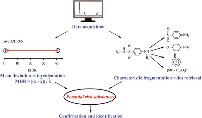 該研究團隊針對非靶向篩查的技術難點——未知風險物鎖定,發展了一種潛在風險物質的快速鎖定方法。該方法首先采用超高效液相色譜-高分辨質譜技術,采集一級、二級質譜的原始數據,經過峰匹配以及濾噪處理后,將獲得的離子數據進行均值偏差倍率(MDR)計算,選定MDR值大于等于20的離子為可能的潛在風險化合物。同時,總結具有特定結構的特定種類物質的特征碎片離子或中性丟失離子,建立特征結構碎裂規律的匹配檢索,并且通過編寫程序實現自動化的數據檢索,從而鎖定特定種類的風險化合物。