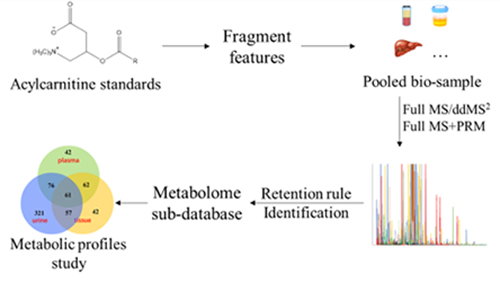 該團隊還建立了用于酰基肉堿分析的液相色譜-高分辨質譜方法(LC-HRMS),構建了包含758種酰基肉堿的數據庫,該數據庫是迄今為止最大的酰基肉堿數據庫。基于該LC-HRMS方法的深度覆蓋分析新策略,可一次性地在臨床樣品中檢測數百種酰基肉堿(Anal Chem.)。