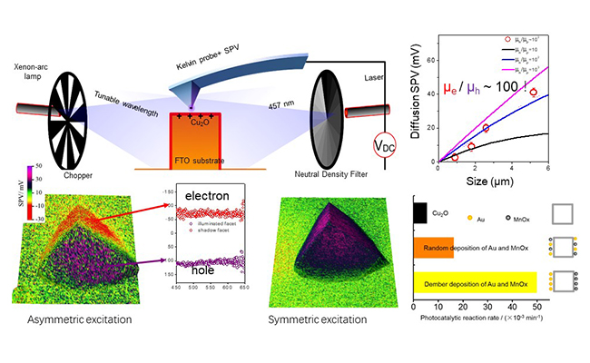 在本工作中,該研究團隊進一步利用空間分辨的表面光電壓譜,表征了不對稱光照條件下單個Cu2O粒子的光生電荷分布,發現了對稱Cu2O粒子可以產生明顯的電荷有效分離——空穴傳輸到輻照區,電子傳輸到陰影區。本工作區分了兩種電荷分離機制,分別是Drifted-漂移電荷分離機制:由Cu2O的晶面內建電場產生,在光照和陰影面呈現對稱分布,僅有利于光生少子遷移至表面,其表面光電壓為10mV;以及Diffused-擴散電荷分離機制:電子和空穴的載流子遷移率差別產生的電荷分離過程,Cu2O向光面和背陰面光電壓差40mV。定量數據表明,除傳統的內建電場導致的電荷分離過程,電子和空穴高達兩個數量級的遷移率差別,可以產生擴散控制的電荷分離過程,且后者對不同晶面的電荷分離貢獻更大。基于以上認識,將氧化還原催化劑分別沉積于單晶粒子的相應晶面,光催化性能可以提高300%。該研究不僅揭示光催化材料中一種新的且有效的電荷分離驅動力,并且為不對稱的助催化組裝,以及空間可控的氧化還原反應提供了新的策略。