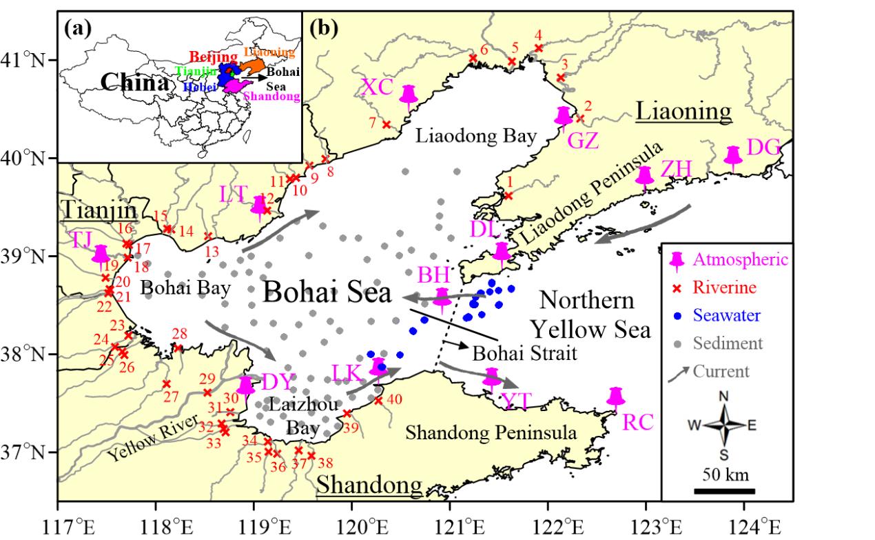 在中國科學院戰略先導專項、國家自然科學基金和中國科學院海岸帶環境過程與生態修復重點實驗室開放基金的支持下,自2013年煙臺海岸帶研究所海岸環境地球化學過程與模擬課題組在渤海區域構建了一個基于12個大氣沉降站和40條河流定點的陸源污染物入海監測體系,同時結合研究所自主航次加強了渤海海水和沉積物的監測。