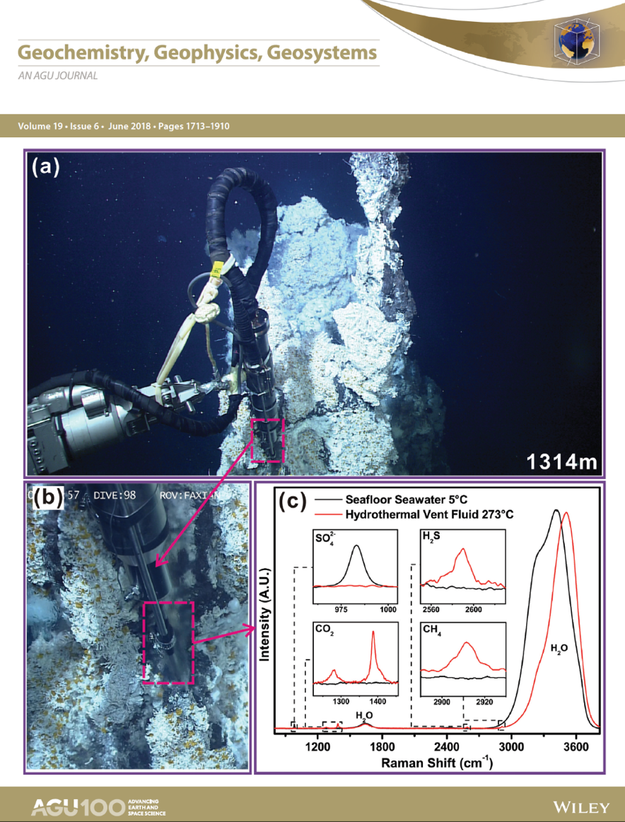 近日,國際地學期刊Geochemistry, Geophysics, Geosystems以封面研究論文形式刊發了中國科學院海洋大科學研究中心閻軍研究員團隊、李超倫研究員團隊在深海熱液系統原位拉曼光譜定量探測方面的最新成果。團隊基于自主研發的深海原位激光拉曼光譜探測系統(Raman insertion probe-RiP)對沖繩海槽中部熱液區的高溫熱液流體進行原位拉曼光譜定量探測,在國際上首次獲得高溫熱液流體中溶解二氧化碳及硫酸根離子的原位濃度。