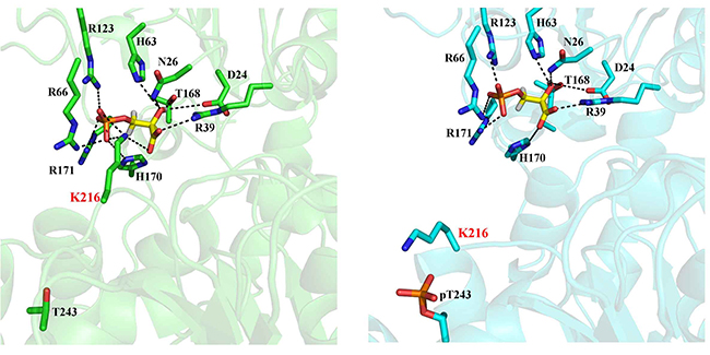 為了回答這一關鍵科學問題,李國輝團隊與楊巍維團隊密切合作,運用分子動力學模擬的方法,針對T243磷酸化前后PGK1與底物結合的分子機制進行研究,并發(fā)現(xiàn)T243的磷酸化影響了另一關鍵氨基酸(K216)的側鏈朝向,進而對PGK1和底物結合的關鍵相互作用產生影響,導致磷酸化前后底物與PGK1親和力發(fā)生明顯變化。這一發(fā)現(xiàn),從分子層面對實驗結果進行了驗證,并為膠質瘤治療的新策略提供了詳細的理論依據(jù)。