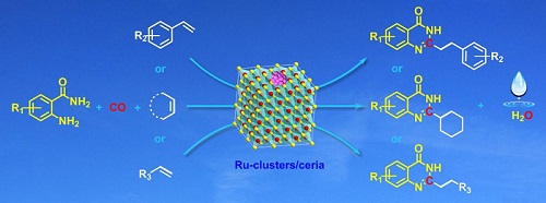 )構(gòu)成的路易斯酸堿對,并在此基礎上首次提出“界面路易斯酸堿對”(interfacial Lewis acid-base pair)的概念(J. Am. Chem. Soc.)。其進一步研究發(fā)現(xiàn),Ru-clusters/ceria催化劑可催化烯烴、CO和胺的三分子反應,生成新的C-C、C-N和C=N化學鍵,從而合成出喹唑啉酮類化合物。該工作現(xiàn)已在線發(fā)表于《德國應用化學》(Angew. Chem. Int. Ed.),并被該刊遴選為熱點文章(Hot Paper)。