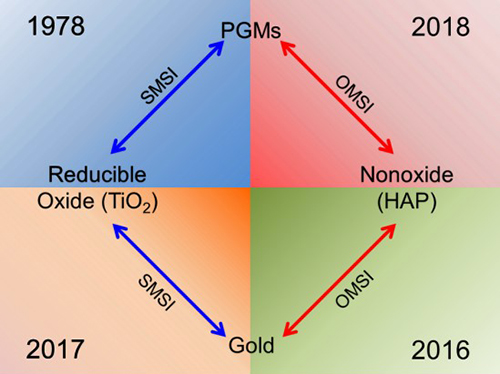 SMSI自發現以來其體系不斷擴展,但大多集中在可還原性金屬氧化物負載的鉑族金屬催化劑體系,且其發生條件也一直限制在高溫還原或超高真空等足以引發載體還原的環境條件。在前期的研究中,喬波濤和張濤團隊與王軍虎團隊在多年羥基磷灰石(HAP)負載金屬催化劑的研究基礎上,首次發現金(Au)與HAP之間氧誘導的SMSI(鑒于其形成環境將其標記為OMSI),該發現不僅成功將SMSI載體體系首次擴展到金屬氧化物之外,并且為穩定型金催化劑的制備提供了一種全新的思路(J. Am. Chem. Soc.)。在該工作基礎上,兩團隊通過對SMSI的調變,設計開發了兼具高活性和穩定性且具有實際應用前景的具有獨特半包裹結構的Au/HAP-TiO2催化劑(Angew. Chem. Int. Ed., Chin. J. Catal.)。此外,兩個團隊在金催化劑體系經典SMSI效應的開發方面也取得了突破性進展,首次發現并驗證了金納米粒子與二氧化鈦之間的經典SMSI(Sci. Adv.),打破了第一副族金屬不能與載體形成經典SMSI的這一傳統認知,填補了經典SMSI效應的空白。