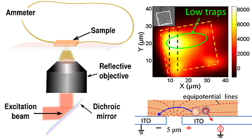 近日,該團隊成功制備出CH3NH3PbBr3鈣鈦礦微晶光電探測器,并采用高空間分辨(1微米,1微米=10-6米)光電流成像技術,研究了其在外加電場下的載流子動力學行為。研究發現,在弱電場下,載流子輸運為擴散機制(diffusion);而在較強電場下,載流子輸運為遷移機制(drift),載流子輸運長度與外加電場強度呈正相關。此外,研究還發現在CH3NH3PbBr3鈣鈦礦單晶中,缺陷態分布也是不均勻的,并影響載流子輸運長度,進而影響器件效率。該結果表明,通過更好的控制單晶中的缺陷態分布可以提升器件整體效率。
