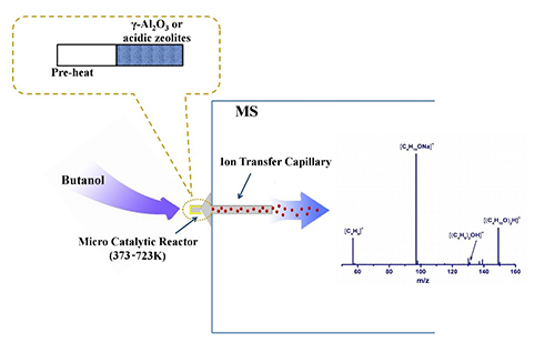 陽離子物種被認為是醇類脫水等異相催化反應過程中的重要中間體,但是由于其壽命短、活性高、濃度低、組成復雜,長期以來缺少可以直接進行高通量全面分析的技術手段。針對此問題,該研究團隊在靜電場軌道阱質譜離子入口處集成了催化反應微型反應器,醇類反應物在加熱和真空條件下快速氣化,通過固相催化劑(三氧化二鋁或分子篩)后直接進入質譜系統(tǒng)進行檢測,極大縮短了陽離子物種進入質譜檢測的時間。同時,由于高分辨質譜的使用,可以通過精確分子量直接確定陽離子的元素組成。