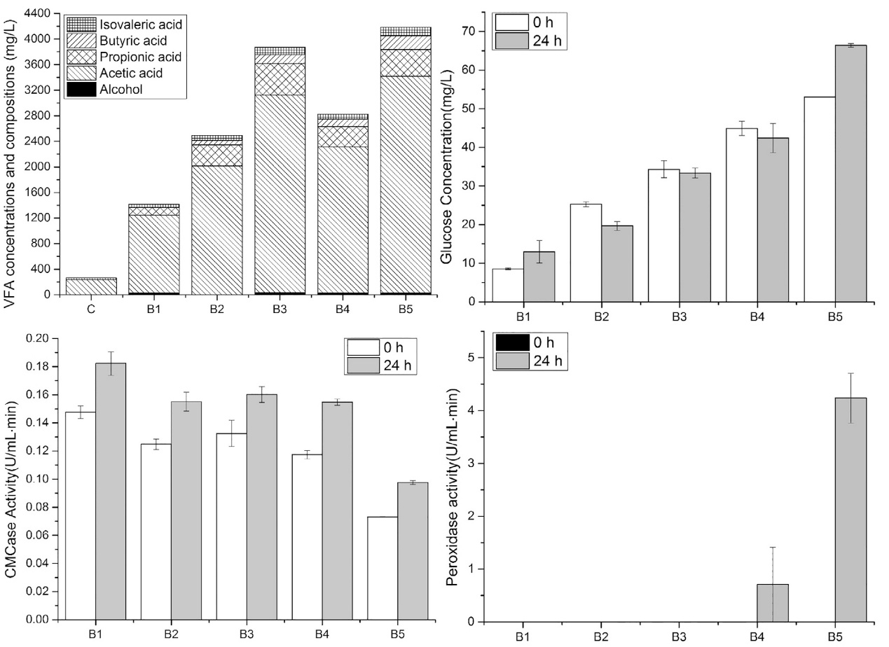 該研究組在近期研究中發(fā)現(xiàn),利用厚壁菌門中枯草芽孢桿菌(Bacillus subtilis)作為微氧預(yù)處理接種物,取代沼液菌群,可提高玉米秸稈厭氧發(fā)酵17.35%的產(chǎn)甲烷量,并將預(yù)處理溫度降低至37 。該工作于2018年7月發(fā)表于Bioresource Technology(2018,259,18-23)。與沼液菌群相比,利用Bacillus subtilis純菌液預(yù)處理后,產(chǎn)生過氧化物酶,酶活達(dá)4.24 U/mLmin;且在24h預(yù)處理后,木質(zhì)素水解率23.0%,半纖維素水解率18.1%,纖維素?fù)p失較少。本研究為微生物-微氧預(yù)處理強(qiáng)化厭氧發(fā)酵技術(shù)的產(chǎn)業(yè)化應(yīng)用提供理論支持,并為進(jìn)一步調(diào)控代謝途徑以提高纖維素生物質(zhì)水解率和甲烷產(chǎn)生量提供基礎(chǔ)支持。