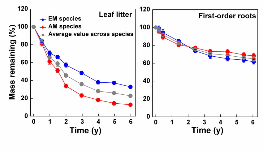 圖1. 不同菌根類型的葉片和根尖為期6年的分解過程