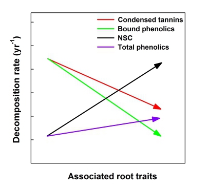 同時,研究人員對分解的控制因素分析表明,與地上葉片分解的調控因素截然不同,氮含量及木質素/氮均不能解釋不同物種間根尖分解速率之間的差異,而一些經常被忽略的非結構性碳水化合物及次生代謝產物(酚及單寧酸)卻對細根分解速率起著主導作用。盡管這些碳屬性物質在根系組織中的含量非常低,但是對細根卻發揮了至關重要的保護和防御功能,也正是這些物質導致細根分解極其緩慢。該研究徹底顛覆了人們以葉片分解速率及其控制因素來推測根系分解的認識,對于全球碳循環模型參數矯正以及全球碳循環變化預測具有重要意義。