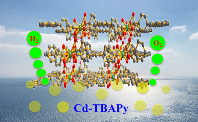 在本工作中,該研究團隊繼續將寬光譜捕光新催化劑開發拓展至金屬有機框架(MOFs)類材料,發現Cd-MOFs材料在可見光激發下具有水氧化和水還原的雙重功能。通過合理選擇1,3,6,8-四(4-羧基苯)芘作為有機配體,與鎘離子配位合成出了新型的二維鎘基金屬有機框架單晶材料(Cd-TBAPy)。研究表明,該材料不僅具有良好的可見光吸收功能,同時具有合適的能帶位置,能夠滿足光催化水分解的熱力學要求。光催化測試表明,在擔載合適的助催化劑及使用犧牲試劑的條件下,該材料可以在可見光照射下分別實現水氧化和水還原半反應,且在420nm光照射下,測得產氧反應的表觀量子效率(AQE)為5.6%。通過熒光光譜和理論計算分析發現,合適的助催化劑擔載及Cd-TBAPy具備的二維層狀 共軛體系共同作用是該材料表現出獨特光催化性能的主要原因。該研究結果表明MOFs類材料在光化學轉化應用方面具有一定前景。