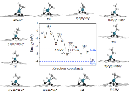 劉洪陽副研究員帶領的研究小組致力于新型納米碳材料負載金屬催化劑的研究。經過多年的學術積累,首次利用納米金剛石/石墨烯復合核殼材料(ND@G)為載體,制備出一種原子級分散高選擇性乙炔加氫Pd基催化劑(圖1)。通過球差電鏡表征(圖2)并結合X射線吸收譜表征(圖3),證實了Pd在碳載體上的原子級分散形式以及局域配位環境中的電子結構和化學成鍵。考慮到實際反應體系中氫的參與和結構的穩定性,他們構建了Pd原子與碳載體三配位成鍵的結構模型,研究了乙炔在此位點的氫化反應機制。利用密度泛函理論(DFT)模擬計算表明,具有單原子Pd活性位點的催化劑,在乙炔氫化反應中,更有利于反應產物乙烯的脫附,進而抑制乙烯進一步加氫反應的進行(圖4)。該項研究為開發新型高效選擇性加氫催化劑提供了新思路。