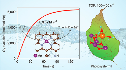 近日,中國(guó)科學(xué)院大連化學(xué)物理研究所催化基礎(chǔ)國(guó)家重點(diǎn)實(shí)驗(yàn)室、太陽(yáng)能研究部院士李燦和博士管景奇等人發(fā)現(xiàn)由氮化石墨烯做基體穩(wěn)定的單核錳活性中心化學(xué)水氧化活性轉(zhuǎn)化頻率高達(dá)200s-1以上,可與自然光合作用體系PSII多核錳(CaMn4O5)反應(yīng)中心的水氧化活性相媲美,并提出單核錳反應(yīng)中心上水氧化反應(yīng)機(jī)理,相關(guān)研究結(jié)果以全文的形式發(fā)表在《自然催化》(Nature Catalysis)上。
