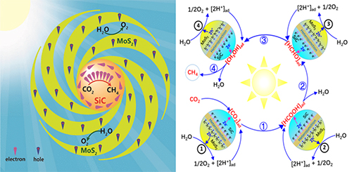 近日,中國科學院大連化學物理研究所催化基礎國家重點實驗室及太陽能研究部李燦院士與福州大學化學學院王緒緒教授課題組合作發展了一種固態Z-機制復合光催化劑,在可見光下將H2O和CO2高效轉化為甲烷(天然氣),實現了太陽能人工光合成燃料過程,研究論文以“Visible-Light driven overall conversion of CO2 and H2O to CH4 and O2 on 3D-SiC@2D-MoS2 heterostructure”為題,在《美國化學會志》(J. Am. Chem. Soc.)上發表。