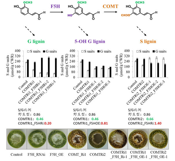 木質(zhì)素是一種由苯丙烷類結(jié)構(gòu)單元聚合而成的大分子化合物,在高等植物的細(xì)胞壁中廣泛存在,是自然界中儲量僅次于纖維素的第二豐富的有機(jī)物。木質(zhì)素的成分主要分為H、G和S三種類型,其含量和比例在不同植物(木本植物>草本植物)以及同一植物的不同組織器官(莖稈>葉片)中各不相同。在植物次生細(xì)胞壁中木質(zhì)素通過形成三維立體網(wǎng)狀結(jié)構(gòu),保護(hù)纖維素和半纖維素不被外界微生物輕易降解,同時賦予細(xì)胞壁足夠的強(qiáng)度和韌性。在農(nóng)作物的品種選育中,常將木質(zhì)素作為細(xì)胞壁品質(zhì)和抵抗逆境(尤其是抗倒伏)的一個重要參考指標(biāo)。另外,木質(zhì)素及其衍生物還是重要的化學(xué)品和生物燃料,具有較高的工業(yè)經(jīng)濟(jì)價值。 中國科學(xué)院青島生物能源與過程研究所付春祥研究員帶領(lǐng)的能源作物分子育種研究組長期致力于高細(xì)胞壁品質(zhì)的作物新品種培育,在木質(zhì)素合成的分子調(diào)控領(lǐng)域積累了豐富的研發(fā)經(jīng)驗。木質(zhì)素合成途徑在植物中較為復(fù)雜,受到多個關(guān)鍵酶基因和調(diào)控因子的共同控制,因此調(diào)控單個酶基因,往往會潛在影響其上下游基因的協(xié)同改變。S型木質(zhì)素主要存在于硬木和草本植物細(xì)胞壁中,與造紙的制漿率、牧草的消化效率和生物乙醇的產(chǎn)量密切相關(guān)。能源作物分子育種研究組通過建立生物質(zhì)能源和牧草飼料雙用作物——柳枝稷的高效多基因遺傳轉(zhuǎn)化體系,對控制S型木質(zhì)素合成的兩個關(guān)鍵酶——阿魏酸-5-羥基化酶(F5H)和咖啡酸-O-甲基轉(zhuǎn)移酶(COMT)基因進(jìn)行了分子調(diào)控,發(fā)現(xiàn)上述兩個酶基因之間存在顯著的協(xié)同調(diào)控效應(yīng)。進(jìn)而通過分子設(shè)計最終獲得了具有不同木質(zhì)素結(jié)構(gòu)的柳枝稷種質(zhì)新資源,用于今后高抗逆高細(xì)胞壁品質(zhì)的優(yōu)良牧草和能源草培育。該研究表明,當(dāng)通過RNA干擾技術(shù)對木質(zhì)素合成途徑的COMT基因表達(dá)進(jìn)行抑制時,會導(dǎo)致S型木質(zhì)素的顯著降低,同時,其上游的F5H基因表達(dá)水平會受到誘導(dǎo)發(fā)生改變。在COMT基因表達(dá)抑制的背景中,進(jìn)一步調(diào)低其上游F5H基因的表達(dá)時,能夠加劇下游COMT基因表達(dá)抑制對S型木質(zhì)素合成的影響;相反,當(dāng)調(diào)高上游F5H基因的表達(dá)后,能夠部分甚至完全消除下游COMT基因表達(dá)抑制對S型木質(zhì)素積累的影響。該結(jié)果清晰地表明,F(xiàn)5H和COMT在S型木質(zhì)素合成過程中存在顯著的協(xié)同作用。