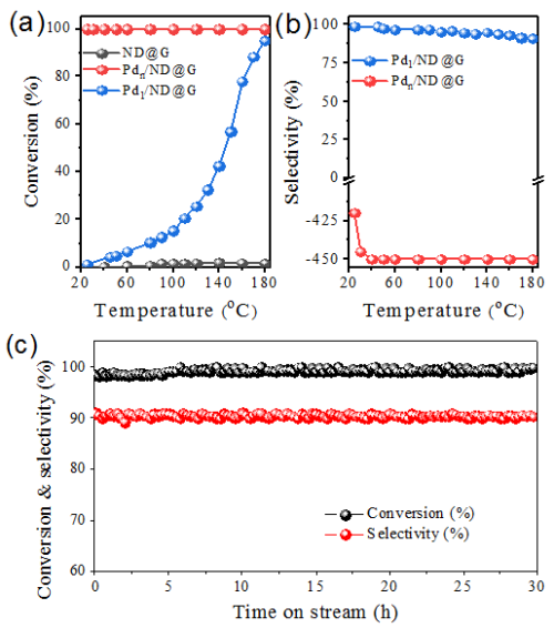 圖 1 催化劑Pdn/ND@G和Pd1/ND@G乙炔加氫反應隨溫度轉化率(a),選擇性(b)及Pd1/ND@G在180oC催化穩定性(反應條件:1% 乙炔, 10% 氫氣, 20% 乙烯混合氣,氦氣平衡; 空速(GHSV) = 60000 h-1)