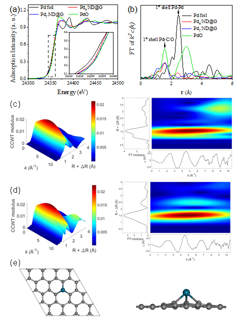 圖3 (a) 鈀X射線吸收近邊結構譜圖;(b) 傅里葉變換后R空間徑向結構函數;(c, d) Pdn/ND@G和Pd1/ND@G的鈀EXAFS振蕩小波變換;(d) 最優結構模型圖
