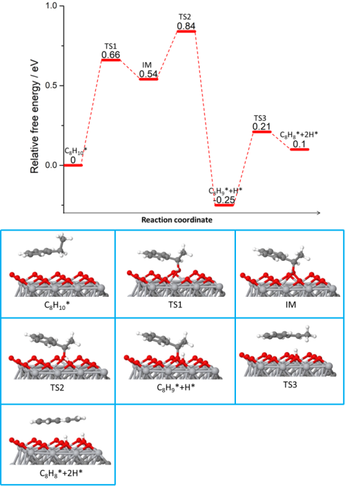 近日,金屬所催化材料研究部劉洪陽副研究員和刁江勇博士等人組成的低碳烷烴活化研究小組與李波副研究員、王曉輝研究員合作,將Ti3C2TxMXene材料用于乙苯脫氫制苯乙烯反應(yīng)中,發(fā)現(xiàn)單位比表面積的MXene材料的乙苯脫氫活性達到了92 mol m-2 h-1,苯乙烯選擇性達到了97.5%,要遠高于目前已知的高活性非金屬脫氫催化劑,并且表現(xiàn)出優(yōu)異的高溫穩(wěn)定性。通過多種表征手段和第一性原理計算,發(fā)現(xiàn)該反應(yīng)以刻蝕過程中產(chǎn)生的C-Ti-O官能團作為脫氫活性位,依次脫去乙苯分子中乙基上的兩個氫原子而得到苯乙烯。同時,MXene材料的層狀結(jié)構(gòu)也有利于反應(yīng)過程中的傳熱和傳質(zhì),從而使該催化劑具有較高的比活性和穩(wěn)定性。
