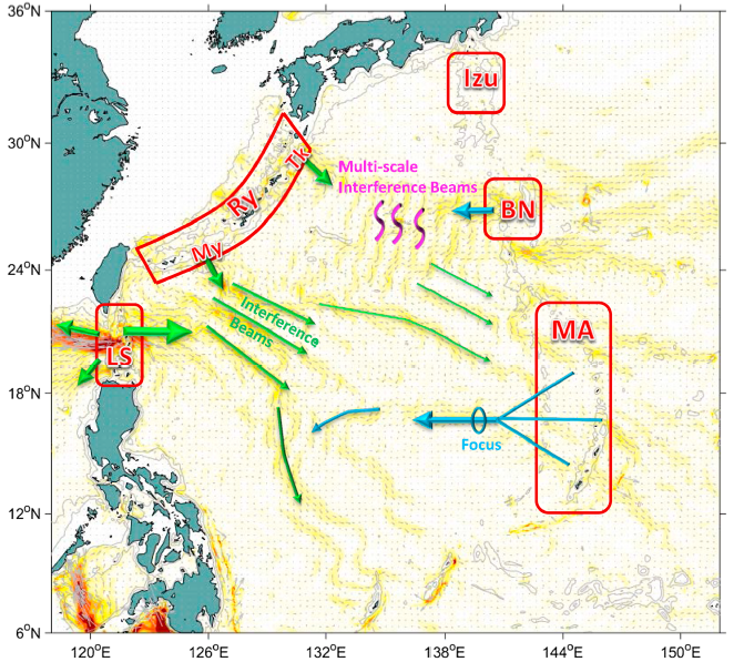 本研究給出了西太平洋菲律賓海半日內潮多源區干涉調制下的長距離能量輻射路徑圖,不僅能夠指導西太針對內波強化觀測站點的合理選定,也可輔助基于衛星高度計和現場觀測資料準確提取多源內潮信號。該工作可對加深理解深海多尺度能量串級過程、改進海洋模式次網格參數化方案提供新思路。同時,因為菲律賓海涵蓋第一島鏈和第二島鏈,是我國從近海走向大洋的關鍵海區,該海域內潮系統研究對于我國海洋環境保障也具有重要的應用價值。