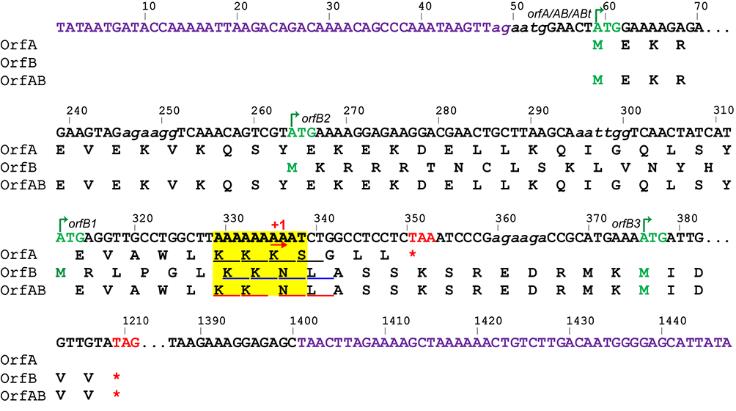 圖1. 來(lái)源于熱纖梭菌的IS1447序列及其轉(zhuǎn)錄滑移位點(diǎn)分析。IS1447可表達(dá)三種轉(zhuǎn)座酶OrfA、OrfB及OrfAB,其中OrfAB為有功能的全長(zhǎng)轉(zhuǎn)座酶。紫色表示反向重復(fù)序列,綠色及紅色分別表示轉(zhuǎn)座酶翻譯起始及終止位點(diǎn),黃亮表示移碼區(qū)域。