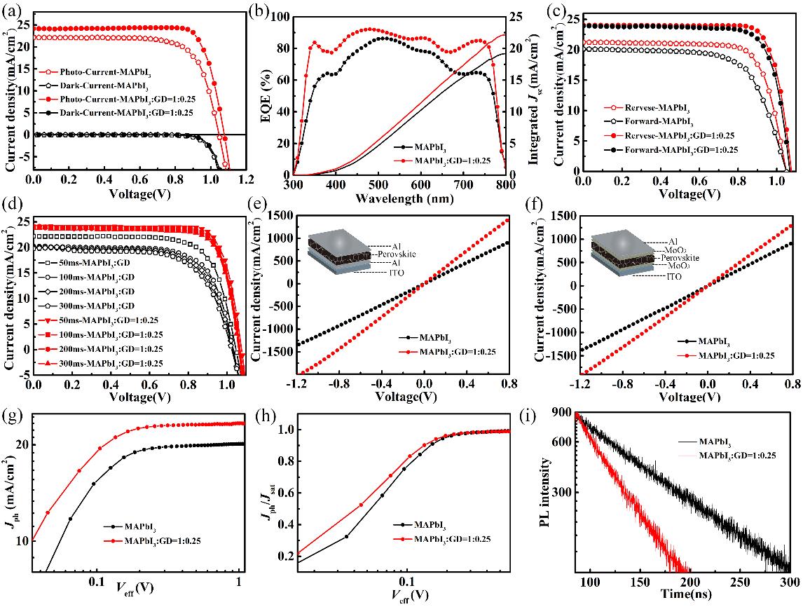 隨后,研究人員從瞬態(tài)熒光、激子產(chǎn)生率、導(dǎo)電性等方面探究了器件性能提升的原因,結(jié)果表明石墨炔的引入不僅有效減少了晶界,抑制了電荷在晶界處的復(fù)合,同時有效提高了電荷的傳輸,這些效果均有利于器件填充因子和短路電流密度的提高,進而提高了器件性能。同時由于鈣鈦礦薄膜質(zhì)量的提高、缺陷態(tài)密度的減少,使得器件的遲滯效應(yīng)和穩(wěn)定性也得到極大改善。