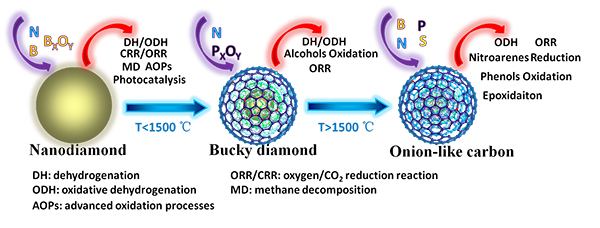 在傳統(tǒng)工業(yè)催化領(lǐng)域中,金屬基催化材料占據(jù)著主導(dǎo)的地位,但是其不可再生性,以及對環(huán)境的污染性是金屬材料潛在的弱點。如何開發(fā)出具有可替代性的綠色能源催化劑是近些年來研究的熱點與重點。納米金剛石是一類sp3雜化的非金屬碳材料,通過簡單控制煅燒溫度(900~1500 ),可得到巴基型納米金剛石(sp3/sp2雜化)和洋蔥碳(sp2雜化)兩種延伸性碳材料。此前,蘇黨生將sp3雜化納米金剛石碳應(yīng)用到催化領(lǐng)域(Angew. Chem., 2010),并得到了國際研究學(xué)者的廣泛關(guān)注。