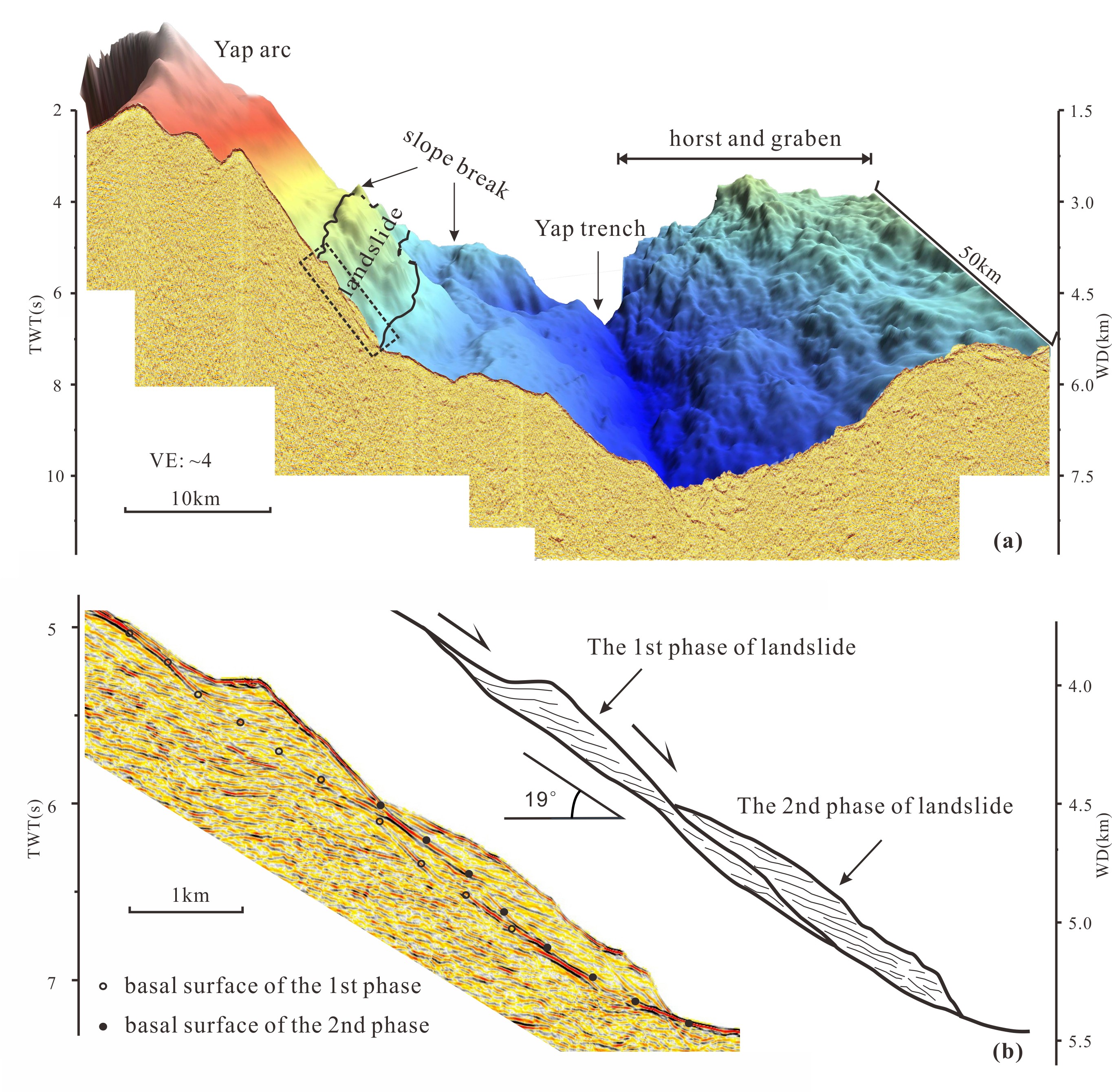 團隊利用“科學”號在該區域采集的多波束和多道地震數據,對雅浦俯沖帶的地貌-沉積特征進行研究。研究揭示,雅浦弧前區域發育一個大型滑塌體,在4000m水深處形成了明顯的坡折帶,而前人一直認為該坡折帶是帕里西維拉地殼內巖性界面出露海底產生的斷裂帶。該研究否定了前人的認識并給出新的解釋,認為在俯沖板片前緣細致刻畫了一個正斷層發育帶,其成因與板片前緣撓曲作用相關;在俯沖板片內部地層內識別了強烈的不整合面,其記錄了卡羅琳洋脊的初始張裂。該觀點修正并完善了雅浦俯沖系統的演化模式,對于重新闡明雅浦俯沖帶的演化模式及過程具有重要意義。