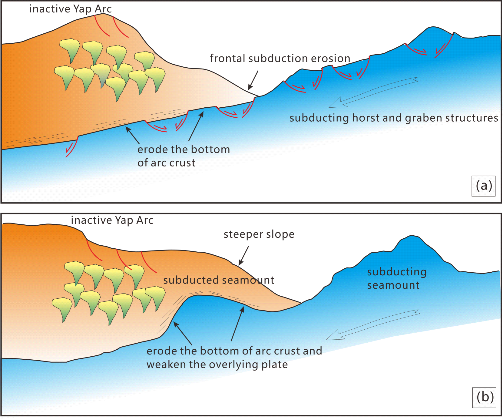 地震剖面揭示雅浦海溝內未發育明顯沉積,俯沖的卡羅琳洋脊對構造地貌具有改造作用,并誘發俯沖侵蝕。俯沖侵蝕是俯沖系統內地殼物質從上覆板塊剝離的地質過程,常伴有較高的板塊匯聚速率。然而,雅浦俯沖帶雖具有典型的俯沖侵蝕特征,如極短的溝弧間距(~40 km)、陡峭的弧前斜坡和沉積物缺失的海溝等,但是板塊匯聚速率極低,因而具有重要的研究意義。研究團隊通過地震剖面解釋和地殼結構正演模擬等手段,首次詳細揭示了雅浦俯沖帶的俯沖侵蝕模型,認為該區域俯沖板塊的粗糙程度與地殼厚度是控制上覆板塊侵蝕過程的主要因素,俯沖板塊內部海山與地壘地塹構造帶的發育導致了俯沖過程中上覆板塊的侵蝕。該模型為全球慢速匯聚的侵蝕陸緣研究提供了很好的實例。