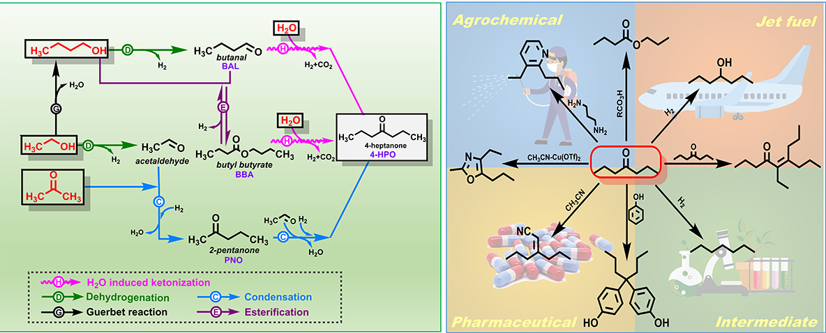 近日,王峰科研團隊采用錫摻雜的二氧化鈰催化劑實現了ABE水溶液的直接催化轉化,碳轉化率可達到70%,主要產物為4-庚酮,其選擇性高達86%。此外,在以往已報道的ABE轉化的催化體系中,人們普遍認為水是催化劑的毒化劑,然而,在本工作的催化體系中,水卻參與反應,促使目標產物4-庚酮的選擇性生成。該過程以ABE水溶液為原料,而產品4-庚酮為油相,因此僅通過傾倒和簡單的蒸餾即可獲得95%純度的4-庚酮。