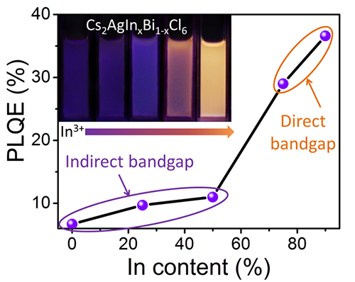 該團(tuán)隊(duì)研究人員合成了一系列雙鈣鈦礦納米晶:Cs2AgInxBi1-xCl6(0≤x≤1)。通過調(diào)節(jié)雙鈣鈦礦中In和Bi的比例可實(shí)現(xiàn)由間接帶隙(x<0.75)到直接帶隙(x≥0.75)的轉(zhuǎn)變。采用飛秒瞬態(tài)吸收光譜分別研究了具有間接帶隙及直接帶隙納米晶的激發(fā)態(tài)載流子動力學(xué),結(jié)果表明間接帶隙納米晶存在較為明顯的“亞帶隙態(tài)”(Sub-band gap),能捕獲激子形成非輻射中心,因此發(fā)光效率低。而在直接帶隙納米晶中,并未探測到明顯的“亞帶隙態(tài)”,激子可以直接復(fù)合發(fā)光。通過調(diào)節(jié)表面活性劑來鈍化缺陷態(tài),直接帶隙納米晶在紫光范圍的發(fā)光量子產(chǎn)率可達(dá)36.6%,接近于含鉛鈣鈦礦納米晶的性能。該研究為進(jìn)一步尋找高性能非鉛鈣鈦礦材料提供了新的思路。