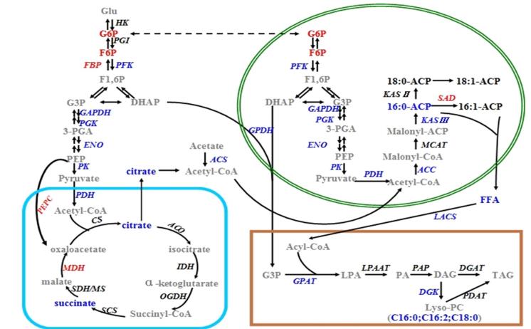 圖1 小型黃絲藻的中心碳代謝流的調節模型和脂質生物合成方案