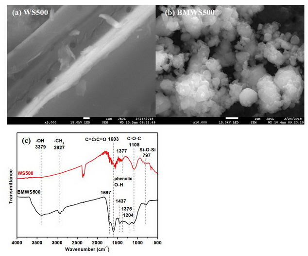 圖1. (a-b) 未球磨生物炭WS500與球磨生物炭BMWS500的SEM圖 (c)WS500和BMWS500的FTIR光譜