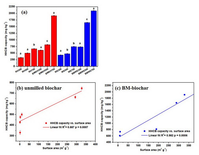 圖2. (a) 原料類型和熱解溫度對未經(jīng)球磨和球磨的生物炭從水溶液中去除HHCB效率的影響 (b-c) HHCB劑量與比表面積之間的關(guān)系