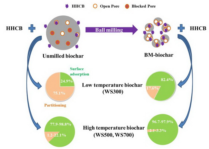 圖3. 未球磨和球磨-生物炭吸附HHCB的機(jī)制