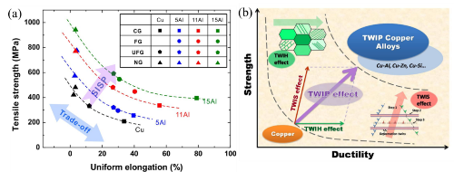 圖2 銅合金同步強韌化的層錯能效應:(a)不同鋁含量銅鋁合金強度塑性倒置關系;(b)銅合金TWIP效應示意