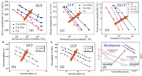 圖3 銅合金疲勞性能提升的層錯能效應:(a-c)超細晶銅鋁及銅鋅合金高周與低周疲勞壽命曲線;