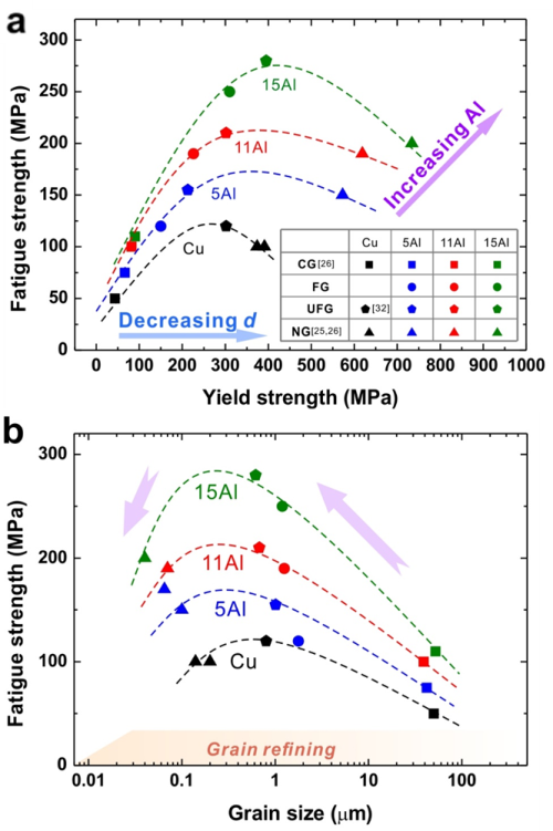 圖4 不同成分與組織銅鋁合金疲勞強度隨拉伸強度(a)與晶粒尺寸(b)的變化