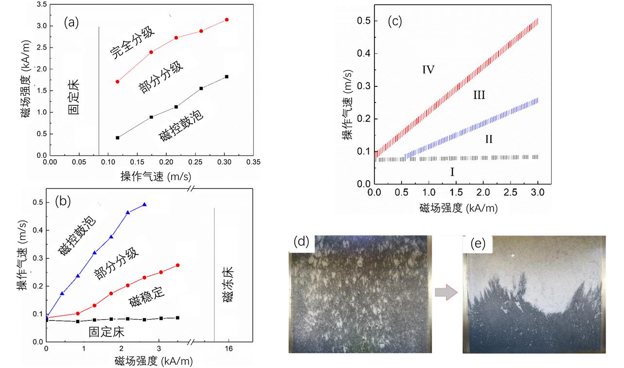 磁場流化床反應器是將鼓泡流化床反應器和電磁場相結合的產物,常用來處理氣固非均相反應,尤其是固體顆粒具有磁性的情況。如果物料是由磁性和非磁性兩種顆粒組成的,被稱為混合物料磁場流化床。同傳統鼓泡流化床一樣,磁場流化床也存在許多流型,每個流型都有自己獨特的流體動力學特性,適用于解決不同的問題。為了充分利用這些流型的優勢,必須掌握磁場流化床存在的流型及其轉變規律。 根據磁場和操作氣速施加的順序不同,磁場流化床有“先加磁場”和“后加磁場”這兩種操作模式。為了揭示這兩種操作模式下的流型及轉變規律,青島能源所多相反應工程研究組開展了詳細的研究工作。通過繪制操作相圖清晰地揭示了混合物料磁場流化床在兩種操作模式下的流型轉變規律,如圖1a和1b所示。同時研究發現:在兩種操作模式下,磁場流化床的流型轉變存在較大差異;在大多數操作區域內(圖1c中I、III和IV),磁場流化床反應器的狀態僅取決于操作氣速和磁場強度的大小,與操作模式無關;但在操作區域II內,磁場流化床的流動狀態不僅與操作氣速和磁場強度的大小相關,還與操作模式密切相關,在“先加磁場”操作模式下,混合物料磁場流化床會形成磁穩定流型(如圖1d所示),而在“后加磁場”操作模式下,混合物料磁場流化床中會發生兩種顆粒完全分級(如圖1e所示)。進一步的研究表明,存在上述差異是因為磁穩定狀態是一種亞穩定平衡狀態,只能在“先加磁場”操作模式下存在,無法通過“后加磁場”得到。處于磁穩定流型的磁場流化床兼具了鼓泡流化床反應器(壓降低)和固定床反應器(單程轉化率高)的優點,特別適用于處理各種氣固接觸傳質體系。本項研究明確了如何獲取磁穩定流型及其操作范圍,對磁場流化床的穩定操作具有極為重要的指導意義。