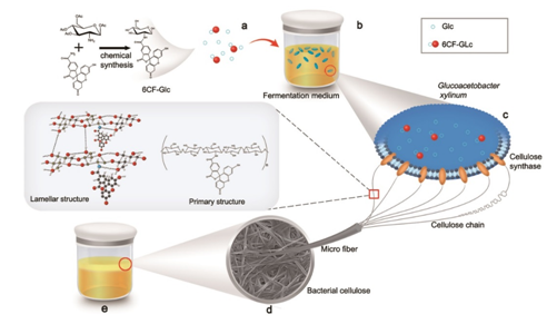 針對上述問題,青島能源所生物基材料組群咸漠、張海波研究員帶領課題組成員獨辟蹊徑開發出一種新型的功能化納米細菌纖維素的制備方法—將6-羧基熒光素修飾的葡萄糖(6CF-Glc)作為底物,利用微生物Komagataeibacter sucrofermentans原位發酵產生具有非自然特征熒光功能性的BC。相關成果已發表于Nature Communications(DOI: 10.1038/s41467-018-07879-3)上。