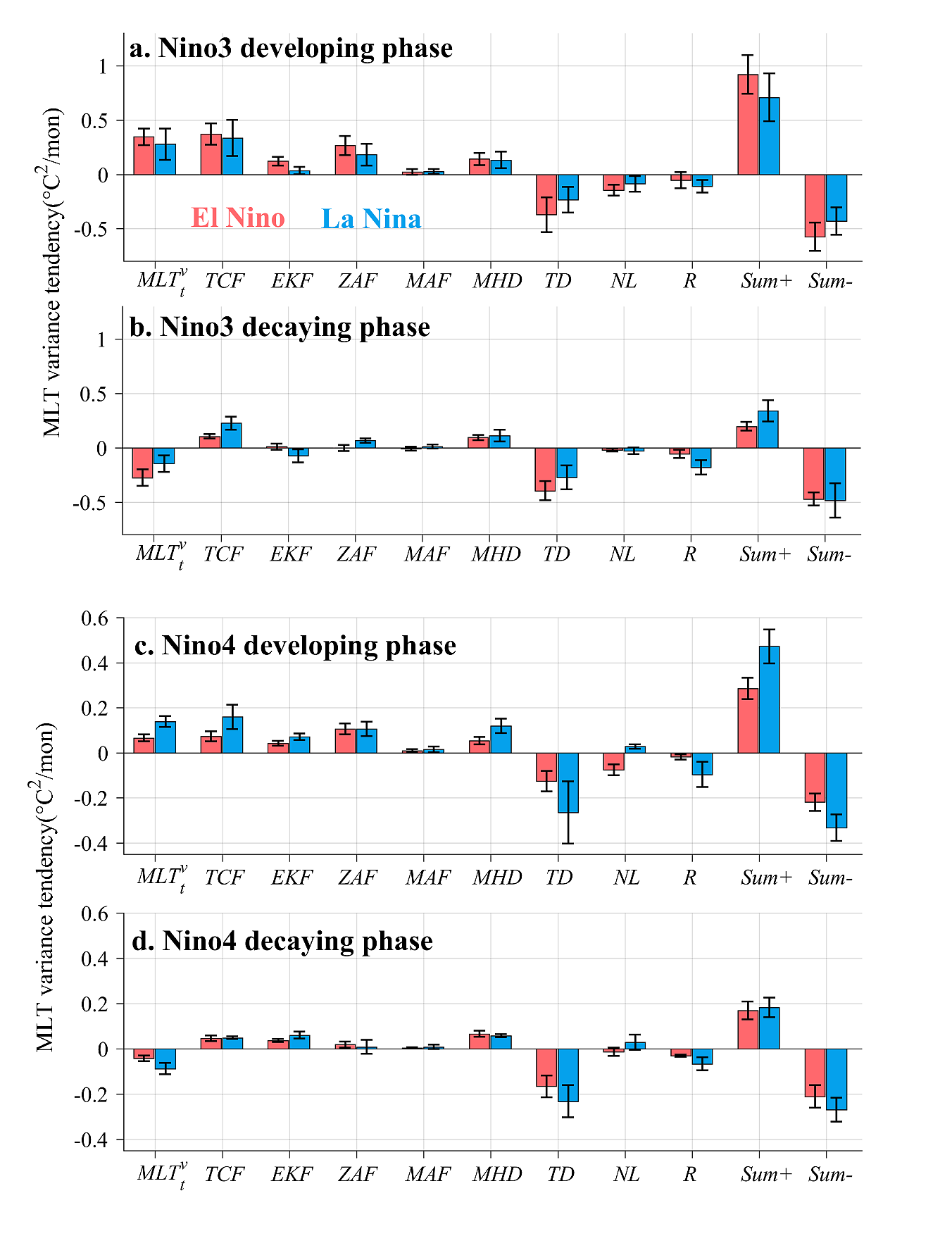 課題組進一步深入研究了各海洋動力學反饋過程在ENSO非對稱性形成中的定量作用。研究人員基于溫度方差收支方程,深入分析了赤道中東太平洋溫度異常幅度的非對稱性和ENSO冷暖位相的持續時間的非對稱性。研究發現,厄爾尼諾期間東太平洋具有更強的正反饋過程,導致厄爾尼諾具有比拉尼娜更大的溫度異常振幅;而在中太平洋,拉尼娜事件由于在發展期具有較強的溫躍層正反饋和較弱的非線性阻尼效應,因而具有更快的溫度異常增長率。同時發現,在厄爾尼諾衰退期溫躍層反饋由正反饋轉變為負反饋過程,使得厄爾尼諾較拉尼娜更快消亡,從而導致ENSO冷暖位相持續時間的非對稱性,而溫躍層反饋過程在ENSO事件衰退期的不同體現了充放電機制的非對稱性。研究成果將顯著提高對ENSO動力學機制的認識,為進一步提高ENSO預測水平提供有力的理論依據。