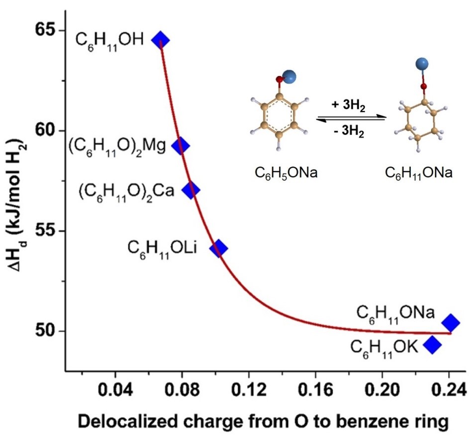 近期,該團隊提出一種全新的策略:利用金屬的電負性差異,修飾有機儲氫材料的電子性質,合成出了一類新穎的有機-無機雜化儲氫體系——金屬有機化合物。理論計算表明,增加有機碳環中的電子密度,可以顯著降低有機物的脫氫焓變,且電子密度越高,脫氫焓變越低,科研人員利用具有較強供電子性質的堿金屬或堿土金屬改性有機儲氫材料,發現其環中電子密度明顯增加,從而有效地降低了有機材料的脫氫焓變;同時理論計算還表明,隨著金屬的供電子性質增強,材料的脫氫焓變越低,即通過選擇不同的金屬,可以可控地調變材料的脫氫焓變,從而在熱力學上控制材料的脫氫溫度。本工作以鈉修飾的苯酚-環己醇為例,計算發現其脫氫焓變可以從64.5kJ/mol-H2降低為50.4kJ/mol-H2;此外,隨著金屬給電子能力增強,環己醇鈉 位C-H鍵鍵長增加,二者成線性關系,這說明材料經過有機無機雜化后,已經被活化,并且脫氫過程中 位C-H鍵優先斷裂。