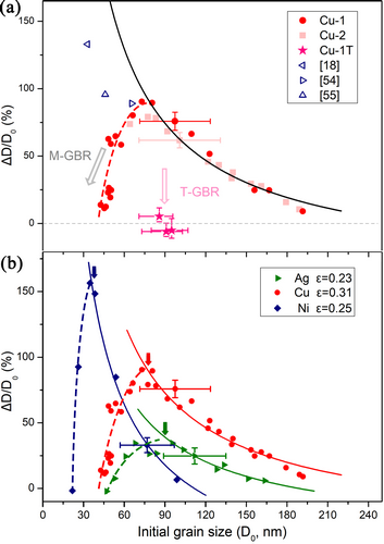 )變化關系,M-GBR和T-GBR分別表示機械誘導和熱處理誘導晶界馳豫效應。(b)表面機械碾磨技術制備純Ag、Cu、Ni樣品相對晶粒尺寸變化率(