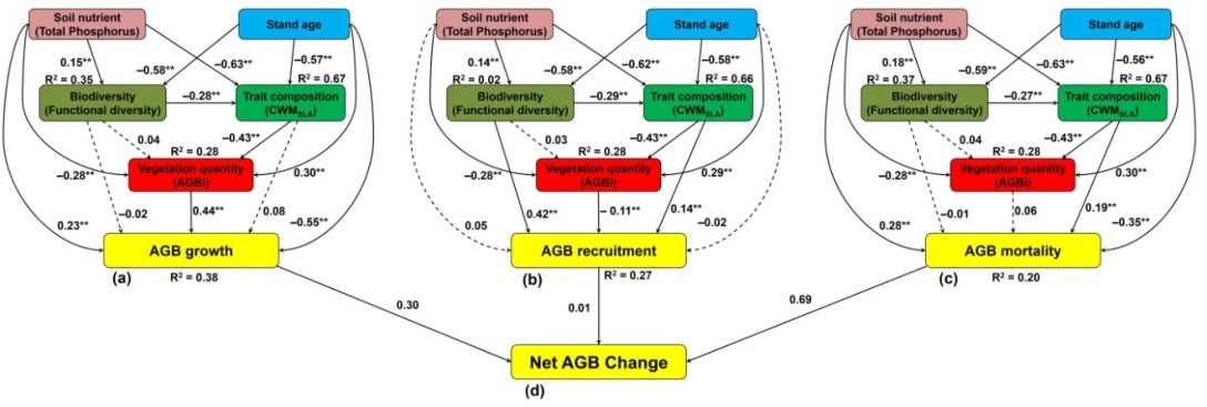 圖1.多重生物和非生物因子影響溫帶森林樹木地上生物量生長(a)、更新(b)、死亡(c)和凈變化量(d)的直接和間接影響