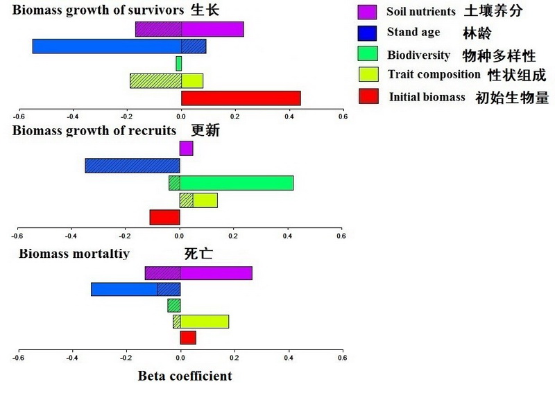 圖2.多個驅動力對樹木生長、更新和死亡的相對影響(填充的直方圖表示該因子的直接影響,帶斜紋的直方圖表示其間接作用)