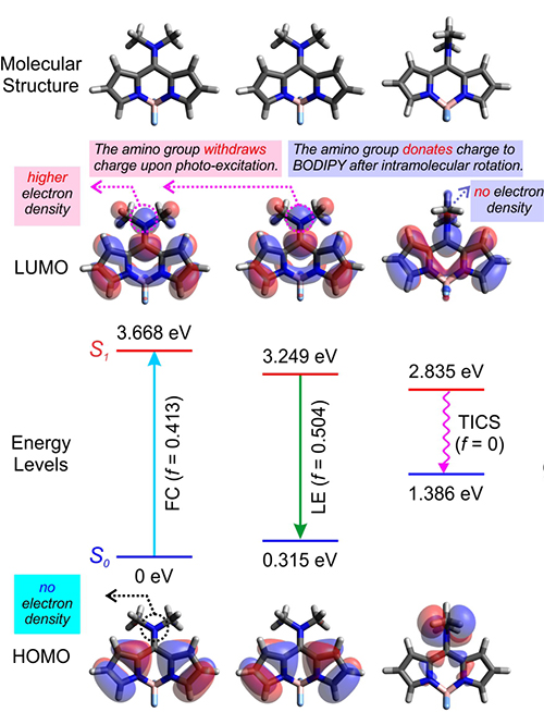 該研究團隊與新加坡科技設計大學教授劉曉剛合作,在前期獲得高熒光強度和光穩定性系列新型熒光染料的基礎上(J. Am. Chem. Soc., 2016),發現了一種新型的光誘導分子內電荷轉移機制,命名為“分子內扭轉電荷穿梭”(Twisted Intramolecular Charge Shuttle, TICS)(Angew. Chem. Int. Ed. )。