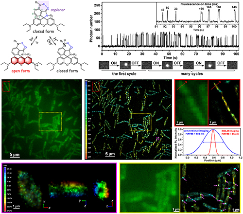 超分辨熒光顯微鏡突破了傳統光學顯微鏡的衍射極限限制,使得光學顯微鏡能夠達到納米尺度的空間分辨率,對生命科學的發展具有重要意義。其中基于單分子定位的超分辨熒光成像技術,需要熒光染料既要具有熒光“開-關”功能,又要具有高熒光強度和好的光穩定性。羅丹明類染料由于其高熒光強度和光穩定性,以及其螺內酰胺衍生物所具有的光激活熒光開關功能已被廣泛使用在超分辨單分子定位顯微成像中。然而羅丹明螺酰胺的開環反應會受到酸性環境的影響,嚴格限制這類染料只能在中性環境中使用,此外其閉環反應速率較慢,導致了這類染料通常被用作一次光激活熒光染料而不是可逆的光開關染料。科研人員通過引進分子內氫鍵穩定螺酰胺結構,報道了一系列熒光螺酰胺使得它們即使在酸性環境中也能夠具有好的光開關性能;進一步共軛修飾6-苯乙炔基萘酰亞胺,將激活光波長紅移到了可見光區域(>400nm),使得該類染料適用于活細胞超分辨成像;最后將這類耐酸性光開關熒光染料標記處于酸性環境(pH 4.5)中的枯草芽孢桿菌細胞膜表面,通過超分辨成像系統得到細菌細胞膜的三維超分辨圖像。