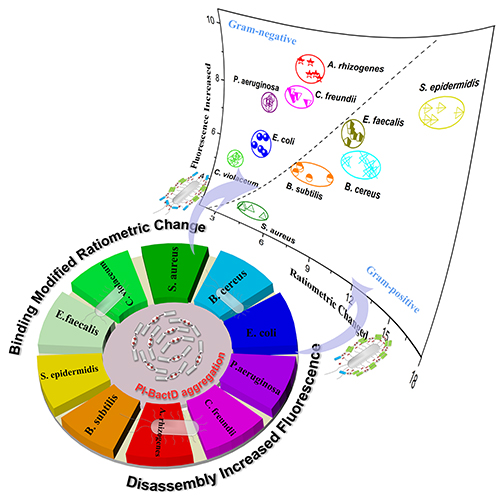 多重耐藥細菌感染已成為病患發生嚴重并發癥和死亡的主因之一。臨床上快速、有效的耐藥菌診斷技術將十分有助于患者獲得及時的治療。細菌臨床診斷包括區分革蘭氏陰性/陽性菌、識別細菌種類、鑒定其耐藥性。常用診斷方法存在操作繁瑣、耗時費力、環境污染嚴重、檢測費用高等缺點。該研究團隊發展了一種對細菌膜表面高選擇性和高靈敏度識別的熒光探針,在30分鐘內成功鑒定了24種細菌的革蘭氏陽性/陰性,并鑒別出其中14種臨床分離的多重耐藥菌和10種細菌菌種。該工作已獲得“中科院威高計劃2019”項目立項,目前正與大連醫科大學附屬二院檢驗科合作,有望發展成為一種快速、準確、經濟的細菌臨床診斷新方法,用于快速鑒定細菌的革蘭氏陰性/陽性、種類和耐藥性,從而指導醫生有效用藥。