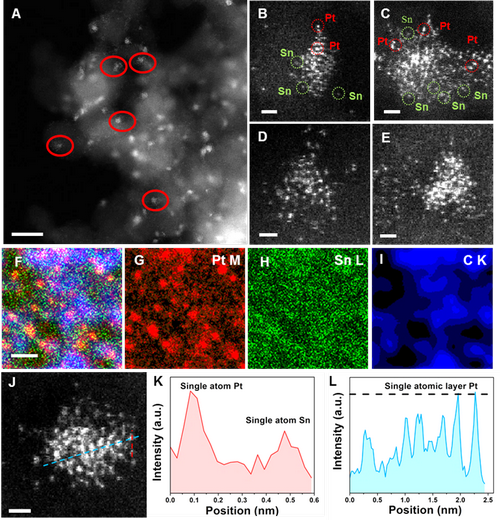 圖 1 原子級(jí)分散的a-PtSn/ND@G催化劑的球差HAADF-STEM 圖像及EDX 分析