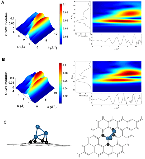 圖2 (A, B) a-PtSn/ND@G和Pt/ND@G的EXAFS振蕩小波變換;(C) 結(jié)構(gòu)模型模擬圖