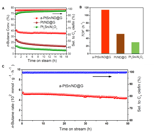 圖 3 原子級(jí)分散的a-PtSn/ND@G催化劑正丁烷脫氫性能:(A)鉑催化劑的轉(zhuǎn)化率和選擇性,(B)TOF對(duì)比以及(C)在450oC催化穩(wěn)定性